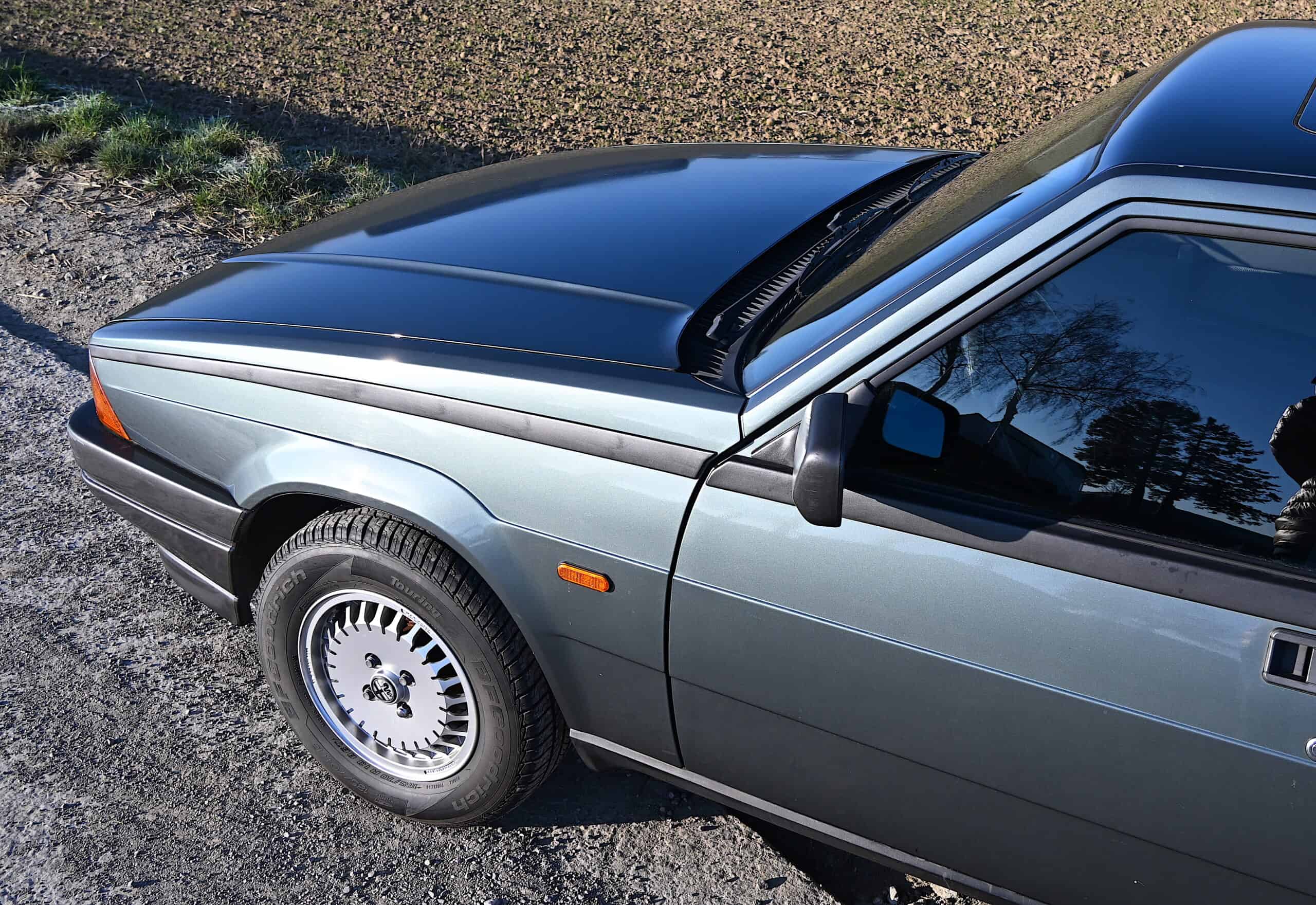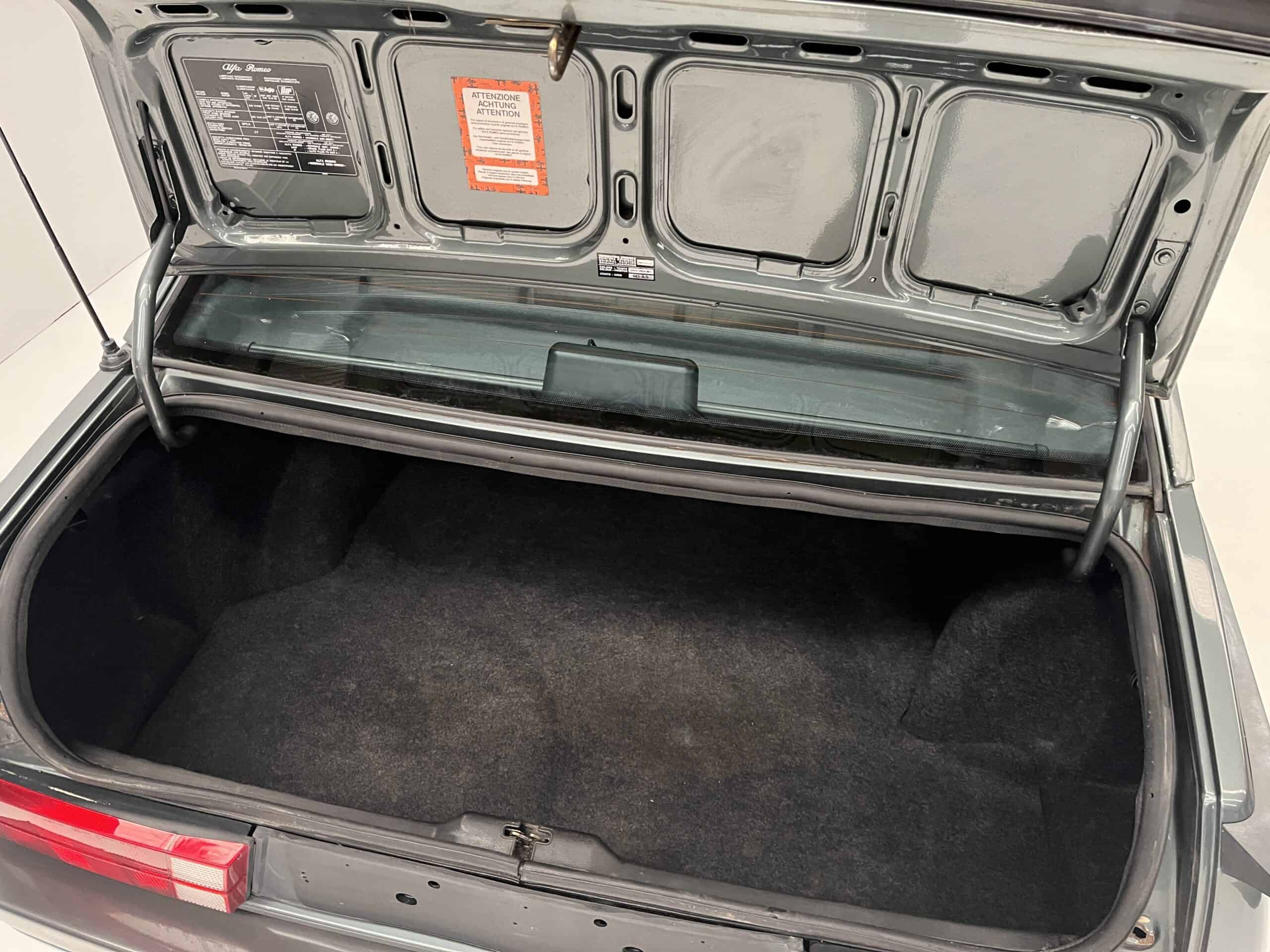 De auto is uitgevoerd in een zeldzame en elegante periodkleur, Grigio Verde Metallizzato met kleurcode 661 A.S., een verfijnde tint die perfect past bij de strakke lijnen van de Alfa 75 en hem duidelijk onderscheidt van meer gangbare uitvoeringen.