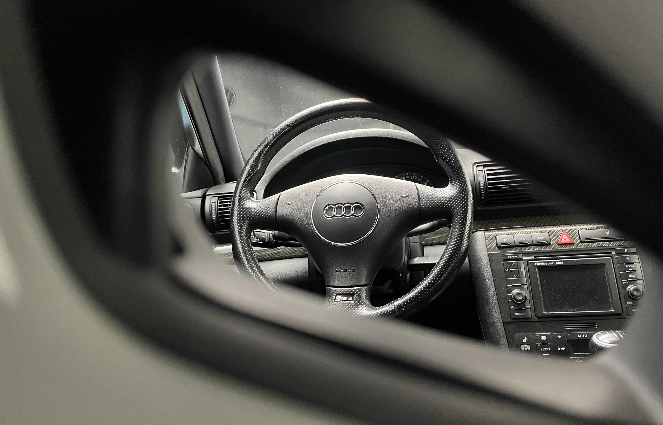L’habitacle associe sportivité et raffinement : inserts carbone d’origine Audi, système Bose avec Navi+, et sièges baquets Recaro Wingback RS4 B7.